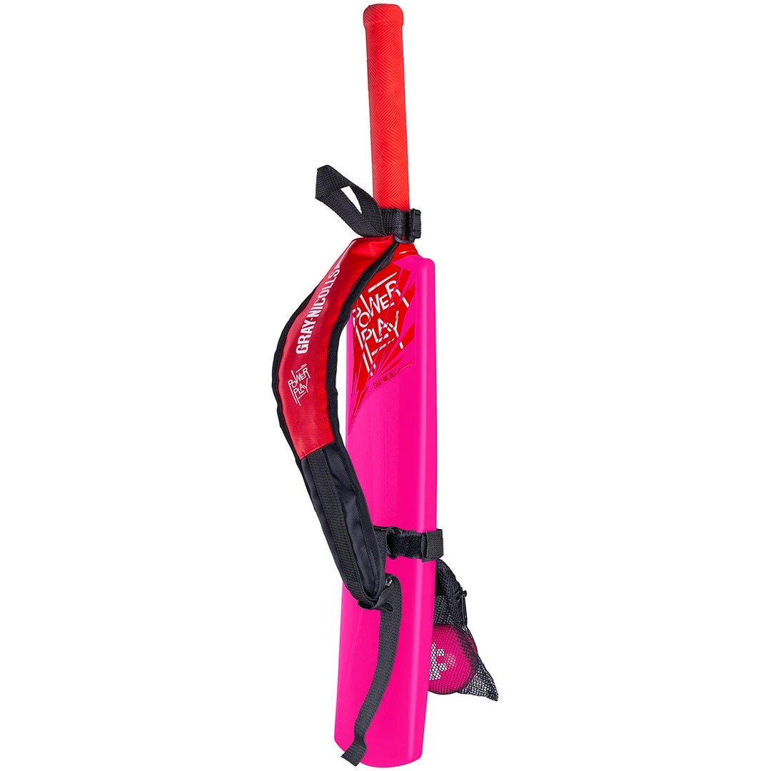 The set comes with an innovative carry strap which means kids can chuck their bat over their shoulder and go, and in the bottom of the bag sits a Powerplay Ball, an incrediball with the Powerplay logo and seam.